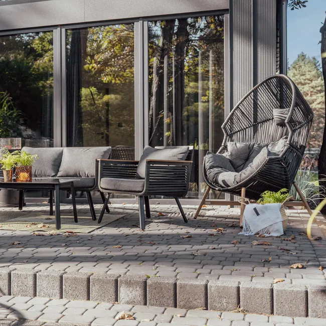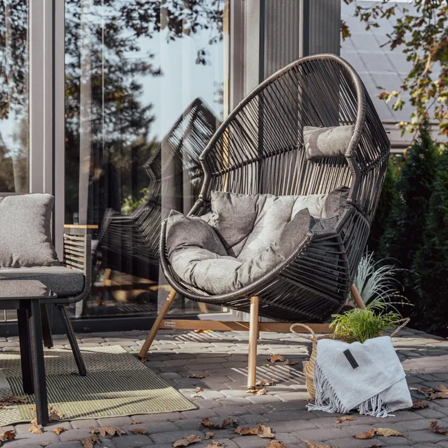 Fotel ogrodowy Holand kokon czarny zapewni niesamowity relaks w przydomowym zaciszu. Dzięki połączeniu ciemnej kolorystyki ramy z nóżkami pokrytymi imitacją drewna, fotel prezentuje się bardzo oryginalnie i daje szerokie możliwości aranżacyjne. Nowoczesny design doskonale wpasuje się w każde otoczenie. Konstrukcja fotela rattanowego wykonana została ze stali, dzięki czemu nie odkształca się i jest stabilny. Do wykonania siedziska zastosowano płaski polirattan, który cechuje się wysoką wytrzymałością i estetycznym wyglądem. Poliestrowe poduszki są łatwe w utrzymaniu czystości. Rekomendowany zestaw z tej samej kolekcji: Holand.