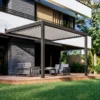 Dołączona pergola bioklimatyczna Genova, wykonana z aluminiowej konstrukcji z dachem z regulowanymi listwami, ma możliwość regulowania mikroklimatu ograniczonej przestrzeni (12 m²), zapewniając jej naturalną wentylację dzięki systemowi silnikowemu. Można go wyposażyć w obwodowe oświetlenie LED (83829209), co zapewni dobre samopoczucie przez 365 dni w roku przy minimalnym zużyciu energii. Nawet w przypadku deszczu ochrona jest maksymalna dzięki obwodowemu zamknięciu, które zapobiega przedostawaniu się wody do wnętrza pergoli. Dodatkowo zapewnia całkowitą blokadę bezpośredniego promieniowania słonecznego i pozwala, przy rozwarciu lamelek pod kątem 45°/135°, wytworzyć naturalny przepływ, który unosi gorące powietrze do góry, tworząc przyjemny klimat w pomieszczeniu. Zawiera silnik i pilota. Wymiary: 400 x 250 x 300 cm (szerokość x wysokość x głębokość).