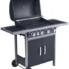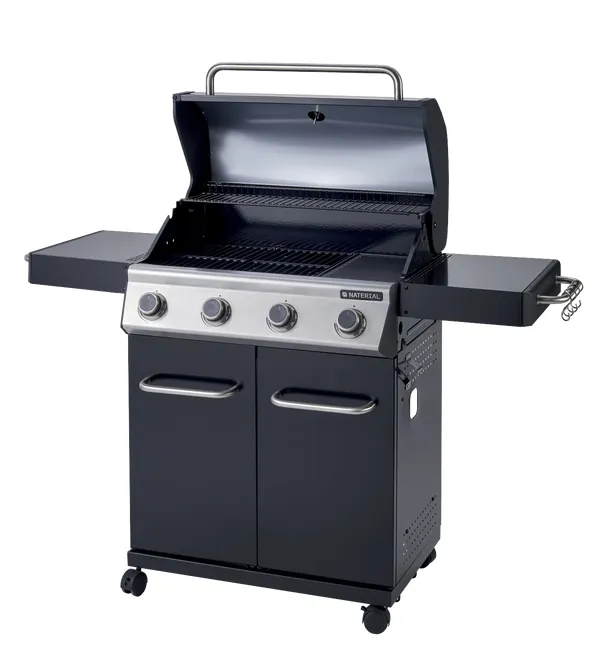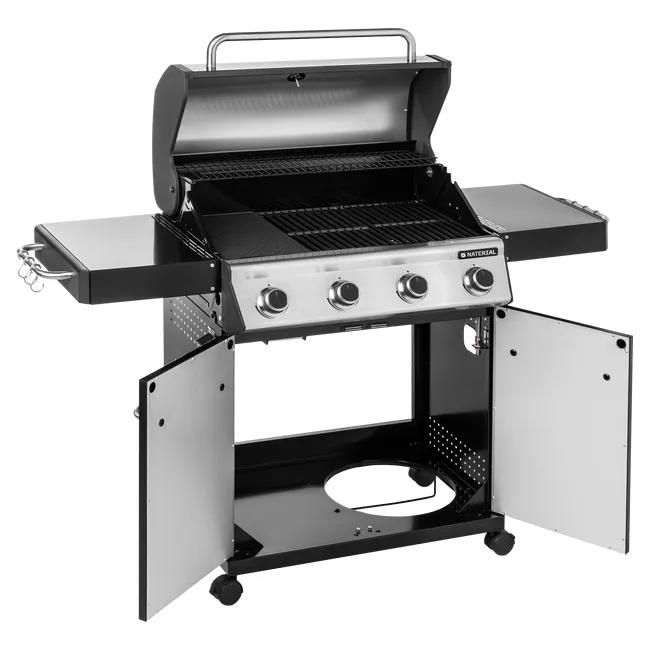 Grill gazowy 4-palnikowy Kenton Naterial posiada różne rodzaje rusztów i płyt, które dają możliwość grillowania dużych i małych kawałków mięsa, burgerów oraz pokrojonych warzyw bez obawy, że wpadną w szczeliny. Zaletą grilla jest wysuwany ociekacz na tłuszcz oraz ruszty z emaliowanego żeliwa, które znacznie ułatwiają czyszczenie. Włącznik zapłonu w pokrętle umożliwia rozpalanie grilla jedną ręką, podczas gdy druga ręka jest zajęta np. trzymamy w niej półprodukty przyniesione z kuchni. Kolejnymi zaletami grilla są obrotowe kółka, które ułatwiają transport grilla w wybrane miejsce oraz półka skrywająca nieestetyczną butlę gazową. Termometr w pokrywie sprawi, że nasze potrawy będą przyrządzone zgodnie z przepisem. Haczyki na akcesoria ułatwiają grillowanie, a dzięki otwieraczowi do butelek jednym sprawnym ruchem otworzymy napój dla spragnionych gości. Składane półki boczne to oszczędność miejsca podczas przechowywania. Grill gazowy Kenton Naterial idealnie nadaje się do przygotowania posiłków na świeżym powietrzu dla co najmniej 10 osób. Posiada 3-letnią gwarancję.