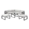 Meble ogrodowe zestaw Odyssea szare Naterial to zestaw składający się z narożnika, dwóch stołków oraz stolika kawowego. Meble wykonane są z aluminium, które jest wyjątkowo wytrzymałe. Siedziska to poduchy z materiału tekstylnego, natomiast blat stołu to szkło. Całość jest utrzymana w szarej kolorystyce, prezentuje się bardzo stylowo i elegancko. Zestaw zapewnia miejsce do siedzenia dla nawet 7 osób i idealnie sprawdzi się w Twoim ogrodzie lub na tarasie. Montaż nie jest skomplikowany i można wykonać go samodzielnie.