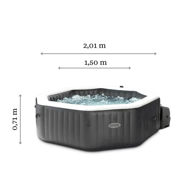 Intex Deluxe Ośmiokątne bańki i dysze spa – 4 osoby – 795L. Połączony system wytwarzania bąbelków wykorzystujący 120 wylotów sprężonego powietrza u podstawy oraz 4 regulowane i regulowane strumienie wody pod ciśnieniem.