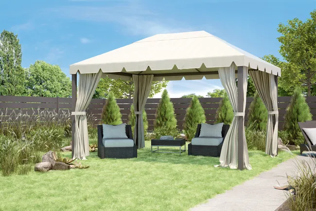 Pergola na taras lub ogród Seria Naterial Ysis ze stalową konstrukcją w kolorze antracytowej szarości i poliestrowym pokryciem oraz zasłonami w kolorze taupe. Jego struktura jest odporna na warunki atmosferyczne. Pokrowiec ma gramaturę 240 g/m², posiada system wiatroszczelny i zajmuje powierzchnię 8,94 m². Zawiera moskitiery zapinane na zamek błyskawiczny i zaciski do mocowania zasłon. Pergolę można przymocować do podłoża za pomocą odpowiednich śrub. Konstrukcja stalowa i śruby ze stali ocynkowanej, zasłony i pokrycie poliestrowe. Wymiary: 299 x 282 x 299 cm (szerokość x wysokość x długość).