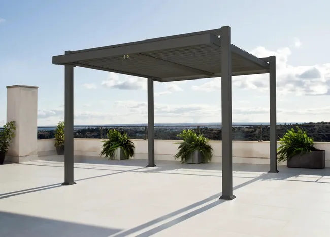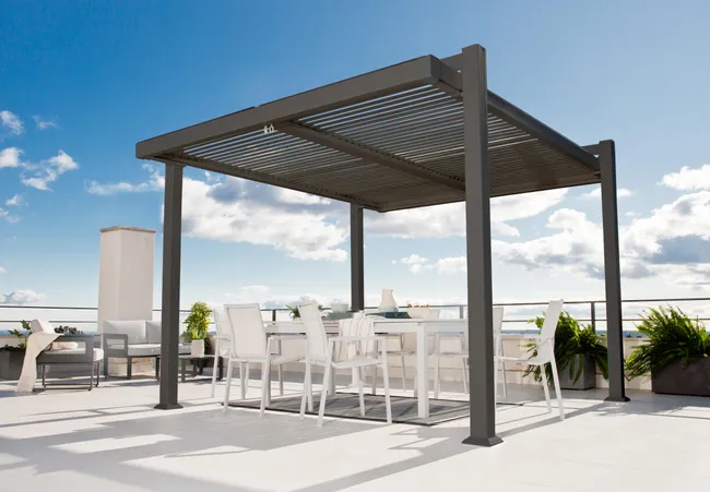 Wolnostojący pawilon PERSEA marki NATERIAL to stabilna i trwała konstrukcja. Dzięki dużej powierzchni można z łatwością ustawić pod nim komplet mebli ogrodowych np. stół i krzesła lub stylowy narożnik z technorattanu. Jego prostokątny dach o wymiarach 3,2 x 3,6 m składa się z aluminiowych poprzeczek, które są wodoodporne i można je ręcznie regulować, aby dopasować ilości światła słonecznego. Zadaszenie ustawione na patio chroni przed słońcem i deszczem przez cały rok. Aluminiowa konstrukcja nie rdzewieje i jest odporna na warunki atmosferyczne. Mocowania ramy i stóp zostały specjalnie zaprojektowane, aby umożliwić odprowadzanie wody deszczowej. Antracytowy kolor i prosta forma idealnie pasuje do nowoczesnych aranżacji. Jakość wykonania potwierdza 5-letnia gwarancja produktu.