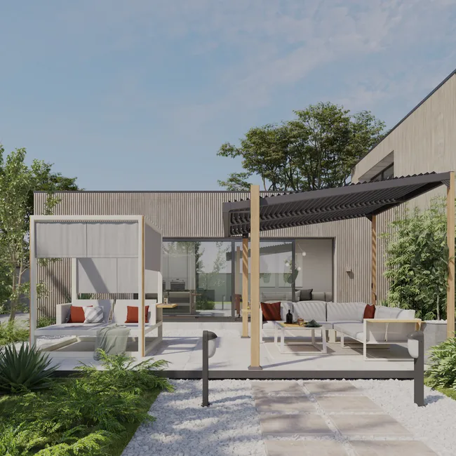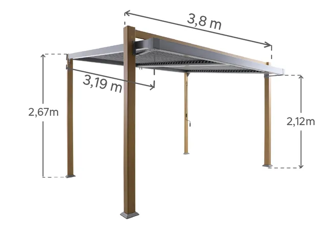 Prostokątna pergola bioklimatyczna na taras lub ogród Naterial Odyssea, z ciemnoszarą aluminiową konstrukcją oraz pokrywą i słupkami z efektem drewna. Osłona posiada regulowane listwy, które pozwolą w prosty i ekologiczny sposób regulować światło i temperaturę, a jej powierzchnia wynosi 11,34 m². Zaprojektowane tak, aby umożliwić odprowadzanie wody deszczowej. Mocuje się go do podłogi za pomocą dostarczonych śrub. Ta pergola o prostym designie, pasującym do wszystkich stylów dekoracyjnych, łączy się z pozostałymi elementami serii Odyssea przeznaczonymi do ogrodu, tarasu lub patio, dostępnymi w Leroy Merlin. Wymiary: 3,19 x 2,67 x 3,8 m (szerokość x wysokość x długość).