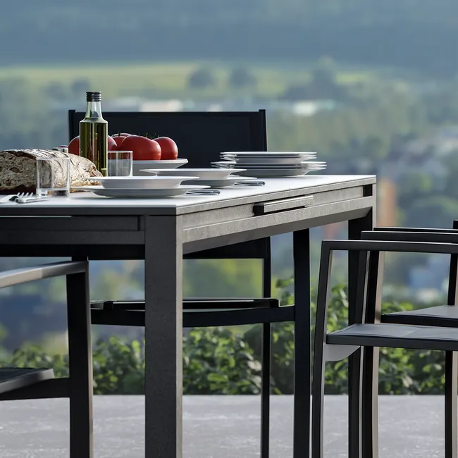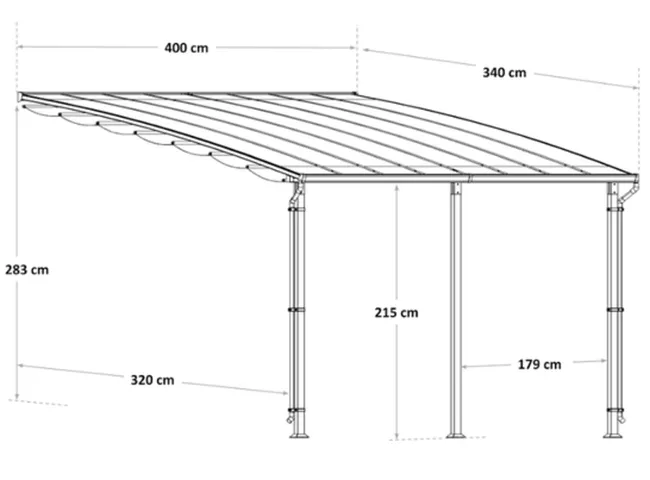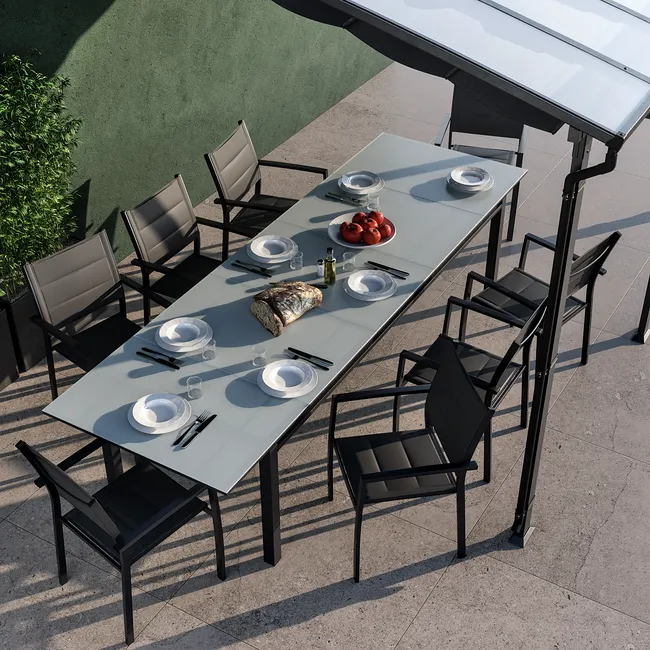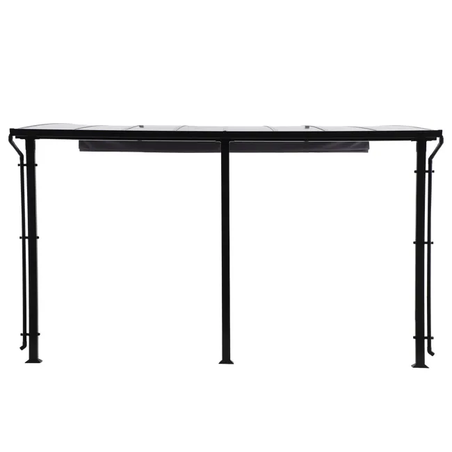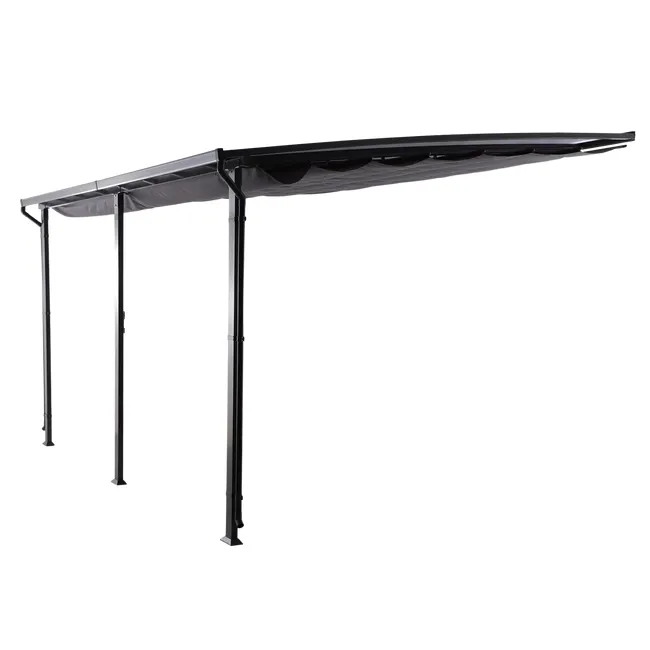 Pergola ze stali Yeena z wykończeniem w kolorze antracytowej szarości. Zaprojektowana do zawieszenia na ścianie pergola Yena pozwala na powiększenie przestrzeni życiowej na świeżym powietrzu, aby cieszyć się przyjemnymi chwilami i jednocześnie chronić się przed słońcem i deszczem. Konstrukcja pergoli Yena opiera się na trzech prostokątnych nogach, a jej duża powierzchnia może pomieścić do 8 osób siedzących przy wspólnym posiłku. Latem możesz cieszyć się zacienionym miejscem i chronić się przed promieniami UV, rozkładając płótno za pomocą prostego ruchu ręka. Zimą chroń się przed deszczem dzięki dachowi z poliwęglanu, wytrzymałego i odpornego na uderzenia materiału termoplastycznego. Pergola Yena posiada system rynien, umieszczonych na nogach konstrukcji, które odprowadzają wodę jak najbliżej gruntu. System ten pozwala nawet na zamontowanie kolektora wody. Zaprojektowana do montażu na stałe, konstrukcja jest w całości wykonana z aluminium. Materiał ten, znany ze swojej wytrzymałości, jest odporny na deszcz i rdzę. Dzięki antracytowo-szaremu kolorowi, stonowany i elegancki styl pergoli Yena upiększa Twoje powierzchnie zewnętrzne. Bardzo łatwy w utrzymaniu: do czyszczenia wystarczy wilgotna ściereczka i neutralny produkt. Wymiary: 400 x 400 cm (szerokość x długość).