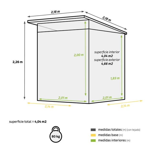 Szopa ogrodowa rzemieślnicza wykonana z żywicy poddanej obróbce anty-UV, wymiary 216 x 226 x 218 cm (szerokość x wysokość x głębokość) o łącznej powierzchni 4,75 m² i grubości 20 mm, z pokrywą z polipropylenu i podłoga w cenie. Zaprojektowany do wykorzystania jako schowek na zewnątrz domu, ma podwójne drzwi wahadłowe z kłódką dla większego bezpieczeństwa i okna z szybami z poliwęglanu. Wskazany do umieszczenia na płycie betonowej o wymiarach 2,14 x 2,18 metra.