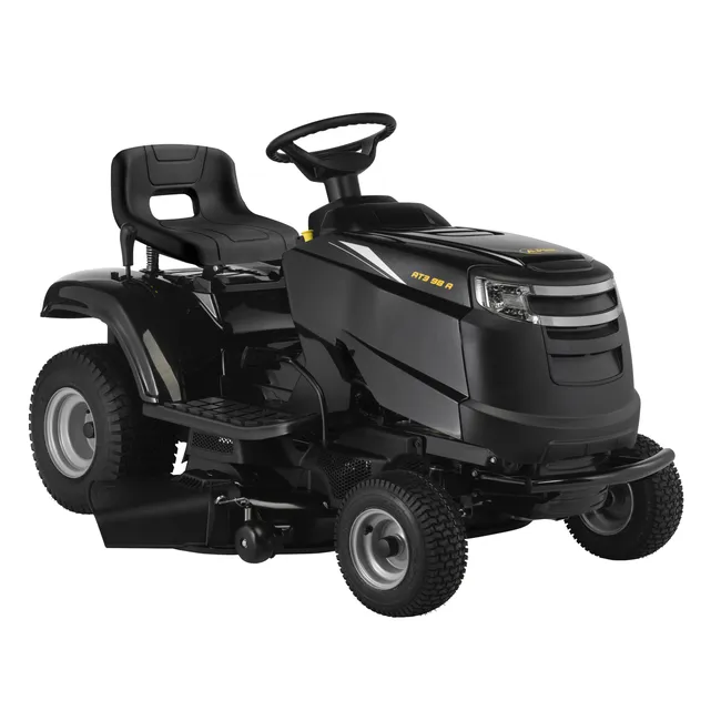 Traktor AT3 98 A – szybkie i wydajne urządzenie do pielęgnacji dużych powierzchni trawników. Ze względu na boczny system wyrzutowy maszyna posiada ogromne możliwości koszenia wysokiej i nieregularnej trawy – długie ścinki trawy są niepraktyczne do zbierania. Ścinki wyrzucane są w równych i uporządkowanych rzędach po prawej stronie traktora, eliminując potrzebę częstego zatrzymywania się w celu opróżniania kosza. Traktor ogrodowy AT3 98 A został wyposażony w silnik Stiga ST 350, wysoce wydajny czterosuwowy napęd o mocy 6,5 kW o pojemności 352 cm3. Silnik Stiga OHV (górnozaworowy) wyposażony jest w technologię minimalizacji hałasu oraz redukcji emisji spalin. Traktor posiada koła napędowe, które zapewniają bardzo dobrą przyczepność podczas pracy na pochyłym terenie lub na mokrym podłożu. Maszyna wyposażona jest w elektromagnetyczne sprzęgło załączania noży, dzięki czemu można je łatwo uruchomić i zatrzymać. Traktor ogrodowy AT3 98 A jest z łatwością dostosowuje się do warunków użytkowania, oferując siedem poziomów wysokości koszenia, opcjonalną funkcję mulczowania, napęd manualny i możliwość wyboru wielu prędkości. Ponadto, traktor wyposażony jest w koła agregatu zapobiegające skalpowaniu trawnika, zapewniające lepszą przyczepność na pochyłym i nierównym terenie. Siedzenie Alpina Smart z podparciem dolnej części pleców gwarantuje komfortową pracę nawet podczas wielu godzin koszenia. Ładowarka nie jest dołączona do zestawu, należy dokupić ją osobno.