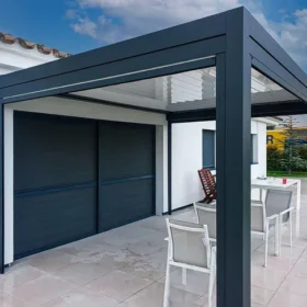 Genova dołączona pergola bioklimatyczna 4×3 m w kolorze szarym z białymi listwami